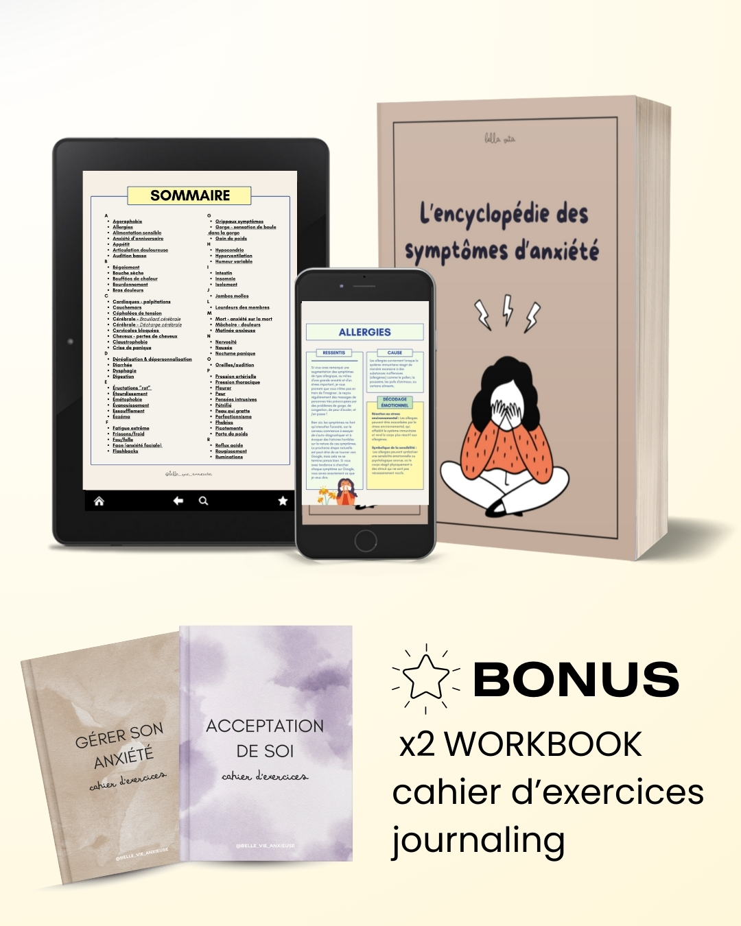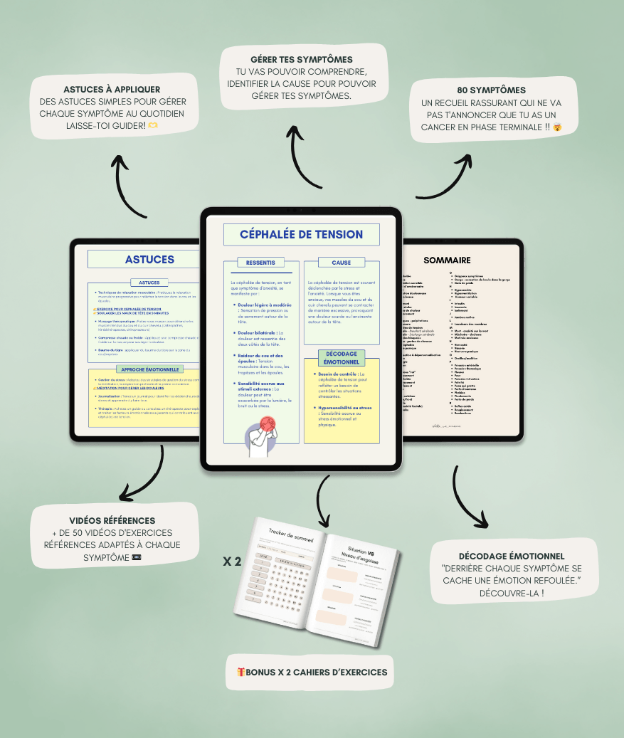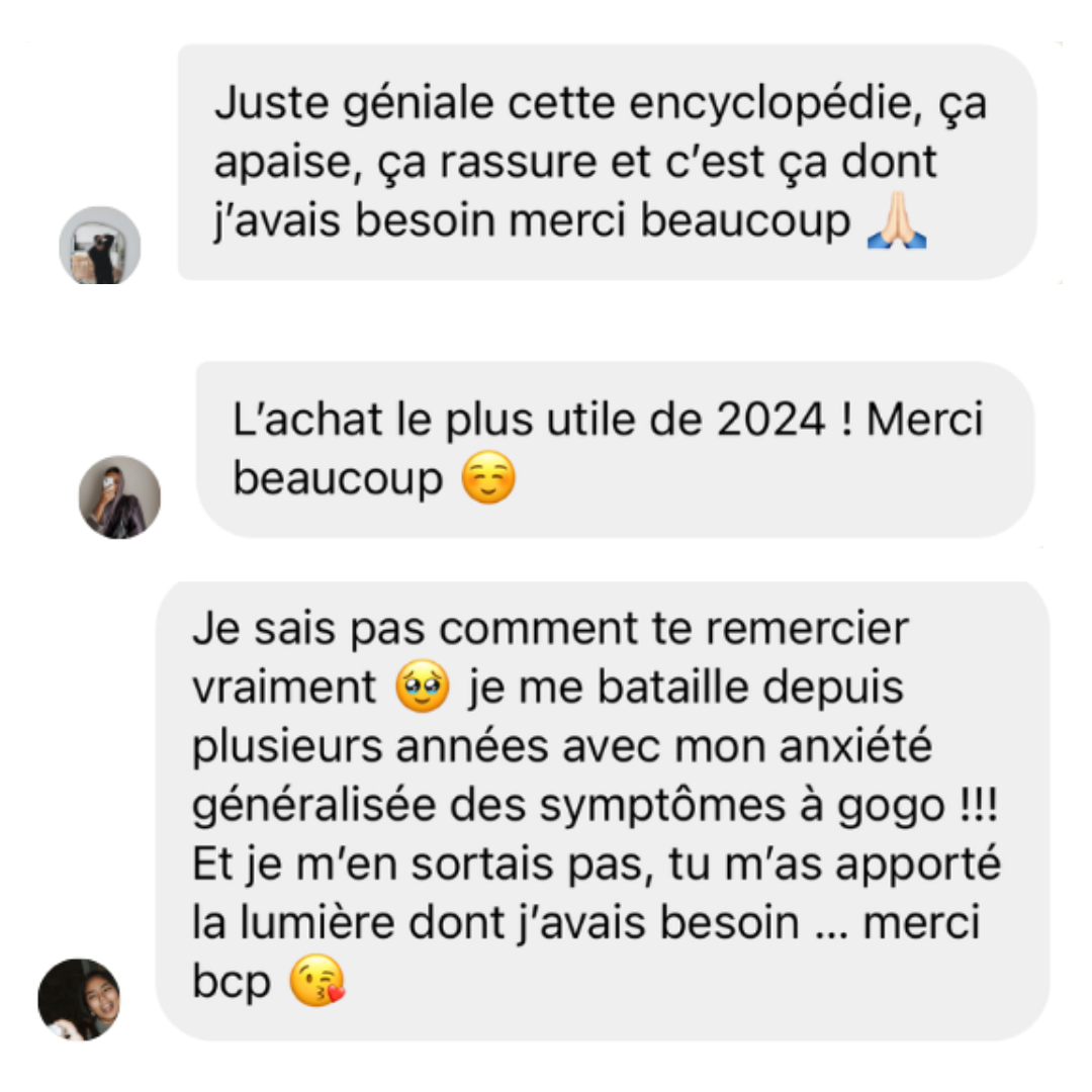 L'Encyclopédie des Symptômes : Plus de 150 pages détaillant + de 80 symptômes pour comprendre, décoder et limiter tes symptômes d'anxiété.